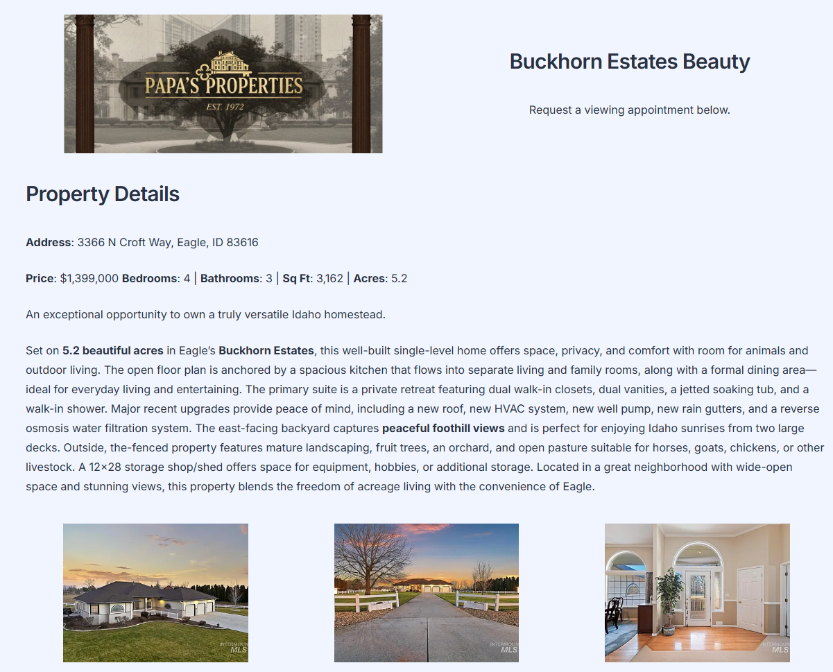 Papa’s Properties had a million dollar plus real estate listing that wasn’t getting the attention they needed. So, I endeavored to help them build a showcase website for the listing, as well as automate data capture for sales leads, and engage their listing agent through automated notifications. Not only was this a fun project, it helped me see some great options available for automation and lead generation.