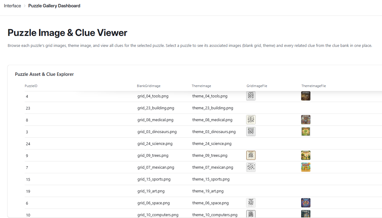 A database and a form that allows for information to be entered. To create the solution I needed to generate a list of Dad Jokes, and put the information into the database. Gemini was a great help once I provided it some samples of where to pull jokes form. I was also able to get the data formatted into a file that I could import to Airtable easily. Further, I was able to instruct Gemini to create thematic media for me to use for the different puzzles, and group like jokes together with themes like “space” and “vegetables”, to make each puzzle more meaningful beyond just the clues for the crosswords.